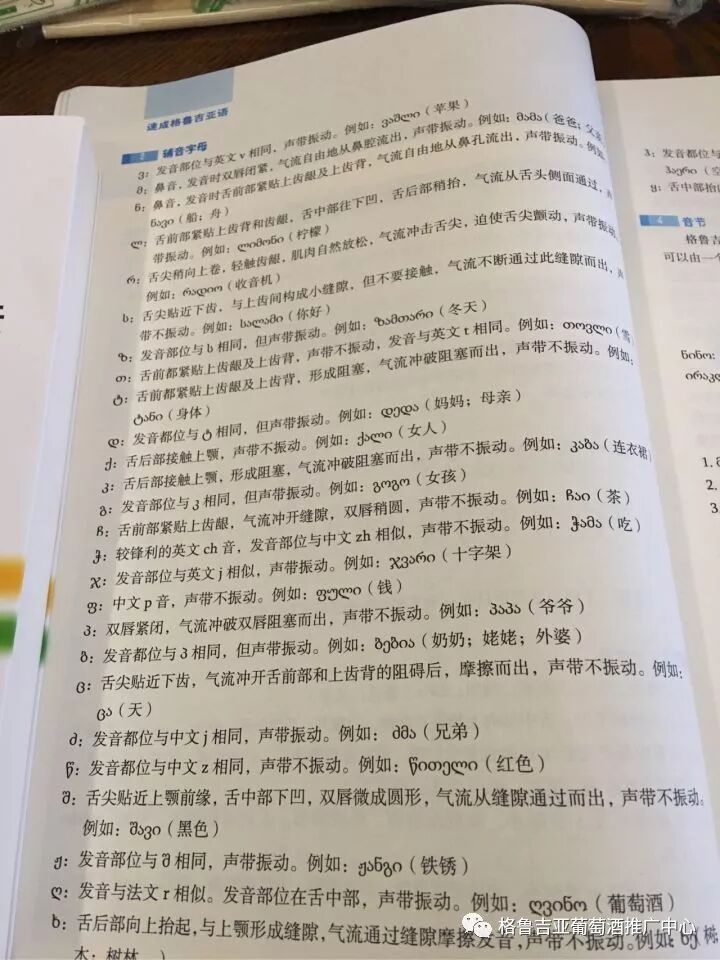 对于很多格鲁吉亚葡萄酒的粉丝们来说,很希望可以学习格鲁吉亚语,但由于语言比较小众,学习途径很有限。University of California, Berkeley的在线教学做得不错;北京外国语大学已经开设了格鲁吉亚语言的课程,也可以参考那达丽 (Natalia Maisuradze) 出版的《速成格鲁吉亚语》教材,通过对本书的学习,能初步掌握格语的基础语法知识和基本词汇。全书共20课,前两课的为语音课,以后每课由语法、对话或课文、注释、生词、练习、介绍格国文化或历史的中文文章等部分组成。